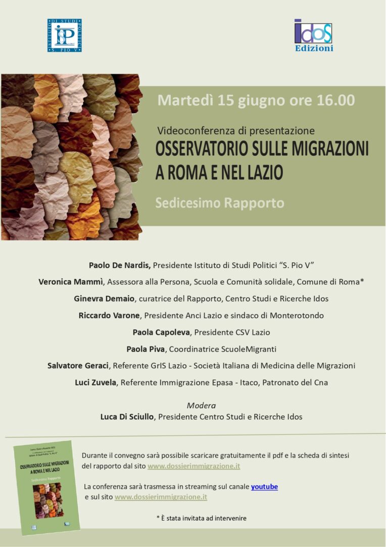 Abbiamo il piacere di annunciare la videoconferenza di presentazione del Sedicesimo Rapporto dell’Osservatorio sulle Migrazioni a Roma e nel Lazio, che si terrà martedì 15 giugno alle ore 16.00.