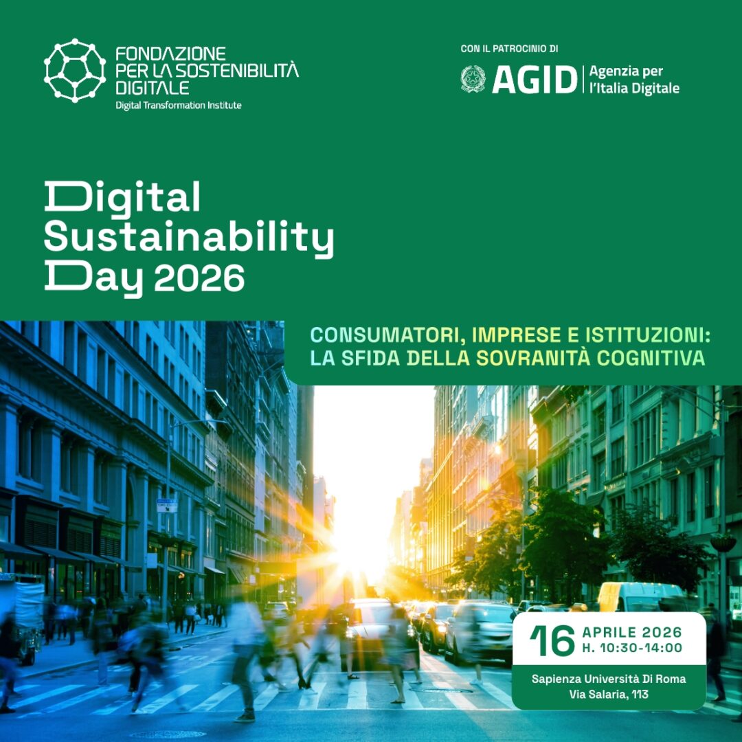 Il prossimo 16 aprile si terrà il Digital Sustainability Day 2026 che quest’anno rappresenta un momento significativo per la Fondazione Sostenibilità Digitale in occasione del quinto anniversario della sua nascita: incontrerà gli stakeholder di riferimento, condividerà i nuovi dati dell’Osservatorio per la Sostenibilità Digitale e presenterà i principali progetti e le loro evoluzioni più rilevanti. Il tema di quest’anno è “Consumatori, imprese, Istituzioni: la sfida della sovranità cognitiva” e introduce una novità metodologica significativa, un doppio asse di analisi che mette a confronto due categorie chiave del sistema socioeconomico italiano: i cittadini in quanto consumatori, attori delle scelte quotidiane che influenzano mercato e società; le piccole e micro imprese, che costituiscono oltre il 90% del tessuto imprenditoriale italiano, ma spesso faticano ad accedere pienamente ai benefici dell’innovazione tecnologica.